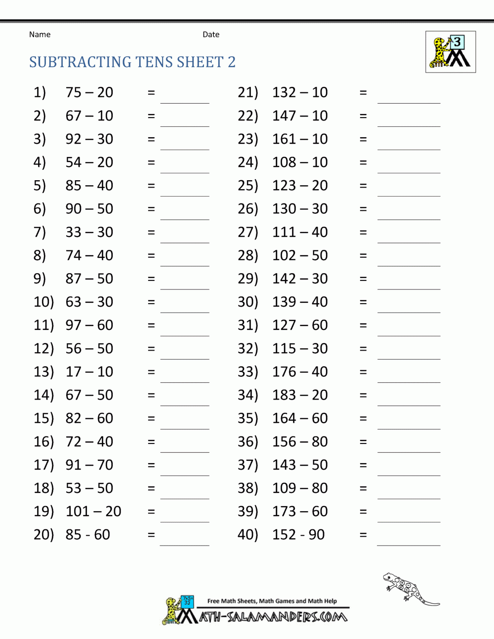 3rd Grade Free Printable Subtraction Worksheets